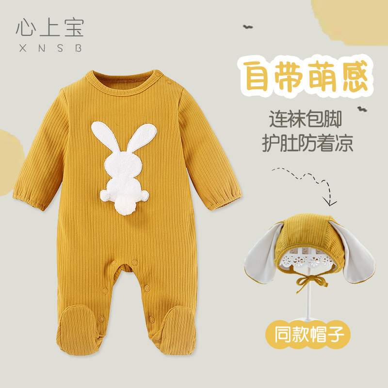 券 2元销量10新生婴儿包脚连体衣服长袖宝宝春秋纯棉坑条哈衣兔子可爱外出爬服
