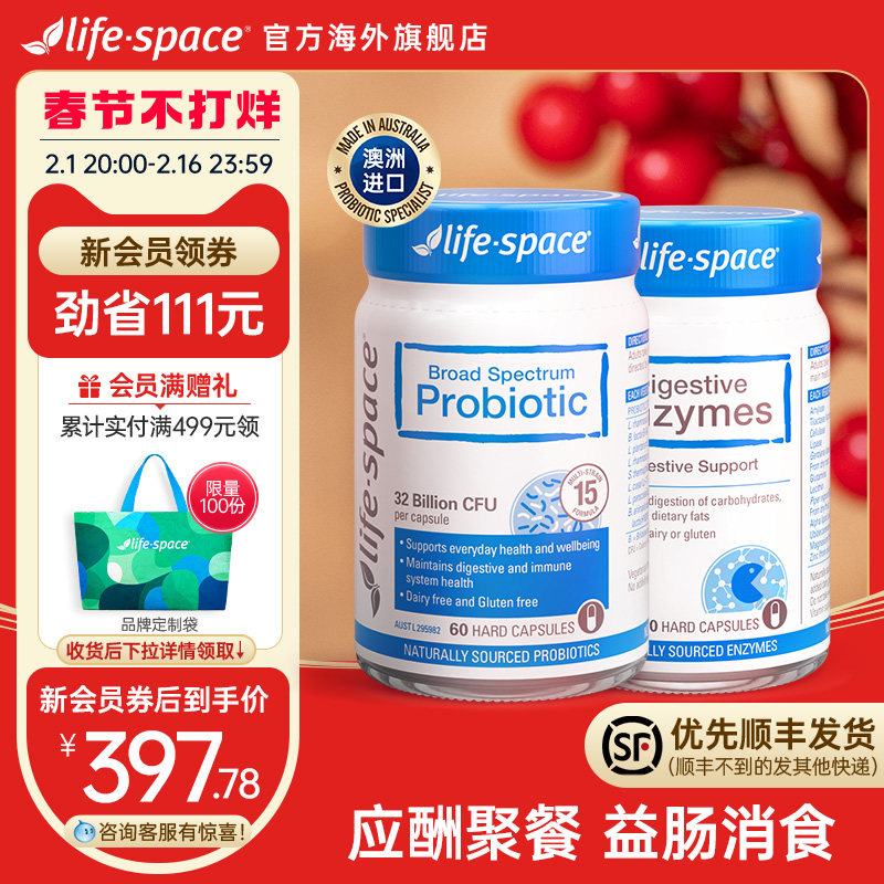 券 50元销量500澳洲进口life space大人广谱肠胃益生菌+消化酶肠道益生菌 组合