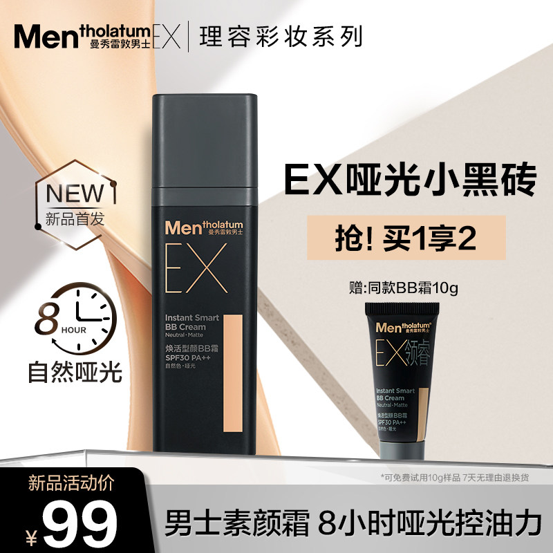 券 10元销量3000曼秀雷敦男士EX哑光小黑砖素颜霜遮瑕膏痘印BB霜粉底液男生变帅