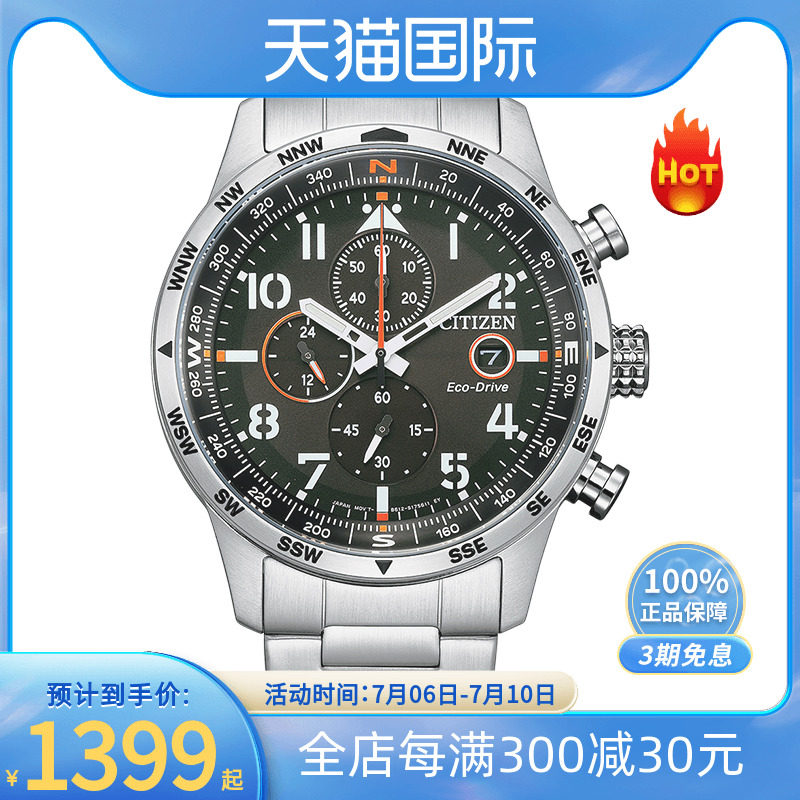 券 170元销量8西铁城男士手表光动能 日本新款三眼计时防水钢带腕表CA0790-83E