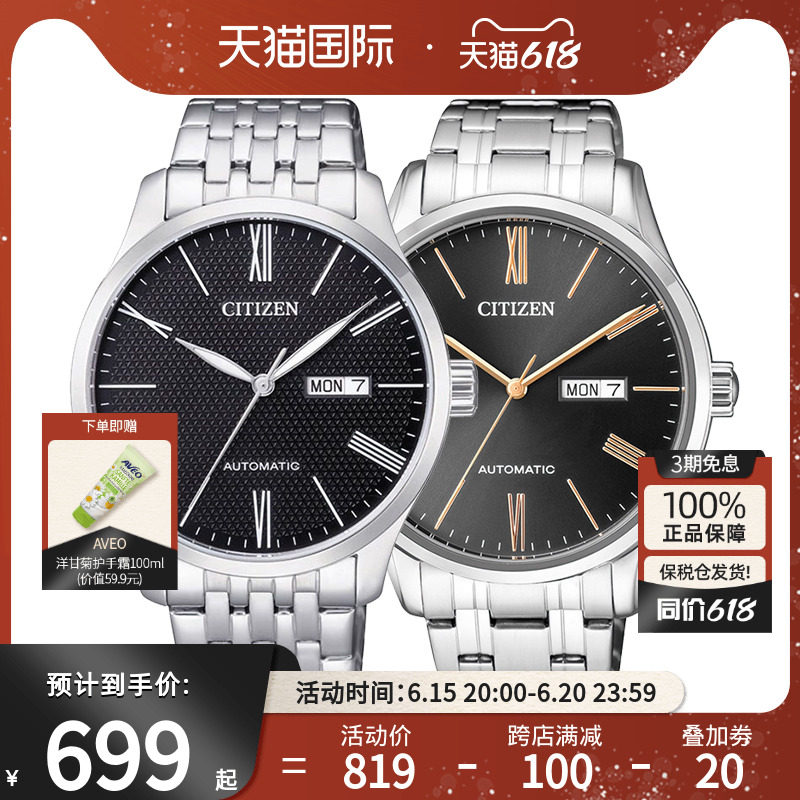 券 40元销量4citizen西铁城男士手表机械表日本双历轻奢防水钢带腕表NH8350-83