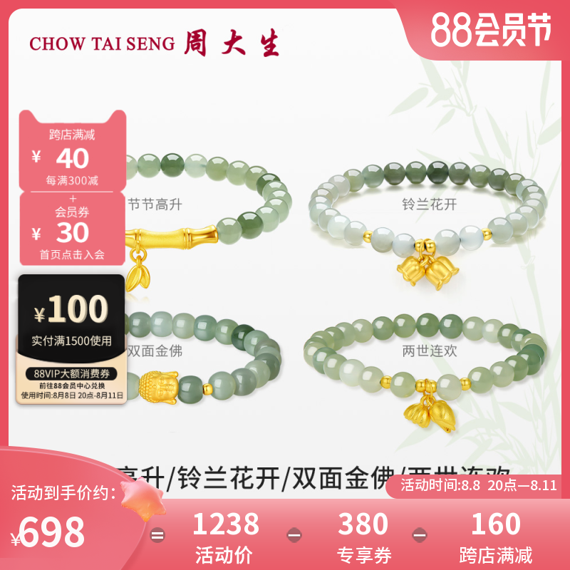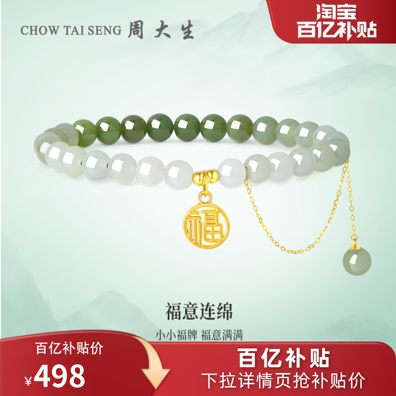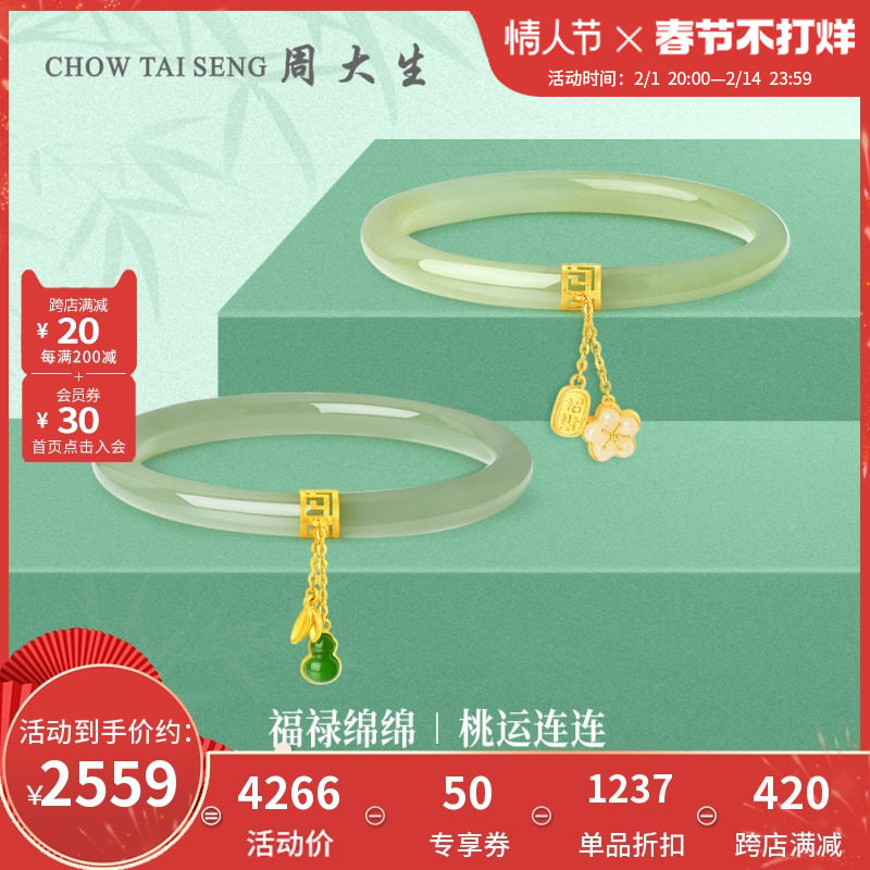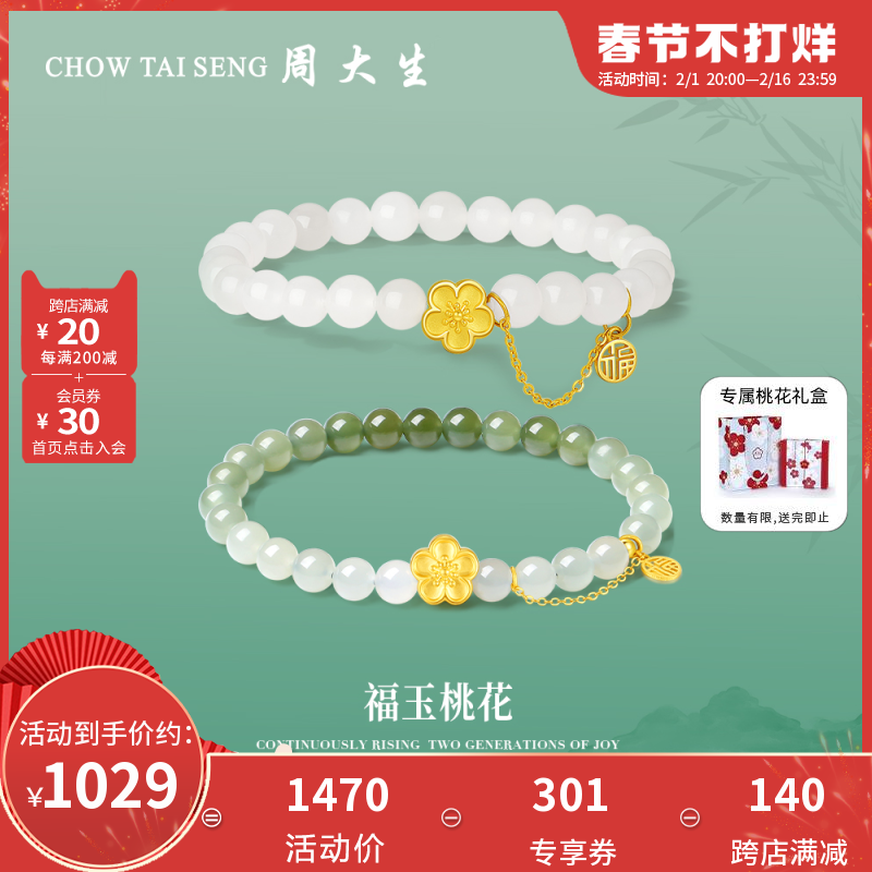 券 380元销量1000周大生黄金镶玉手串女足金桃花福字牌和田白玉手链硬金送女生新年