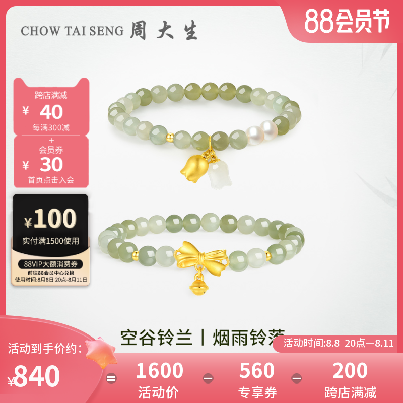 券 592元销量14周大生黄金镶玉手串女硬金幸福铃兰铃铛手链手饰七夕送女友礼物