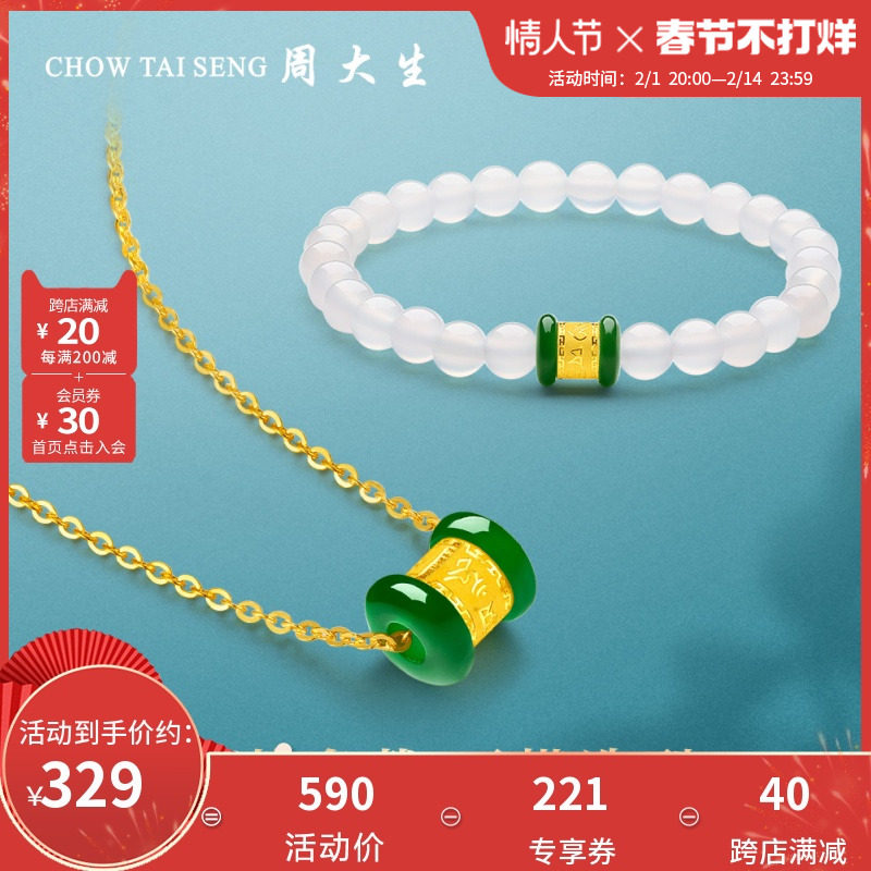 券 250元销量9周大生黄金镶玉和田碧玉吊坠项链足金转运珠白玉手串手链女友礼物