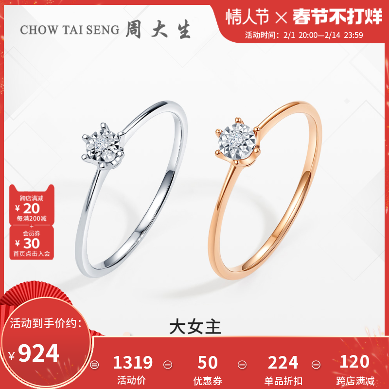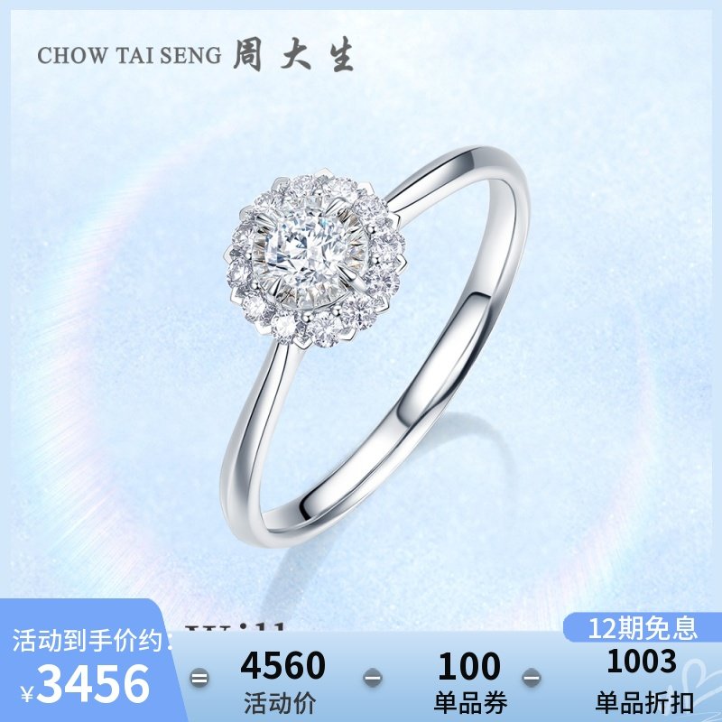 券 50元销量10周大生钻戒女18K白金六爪求婚结婚订婚钻石戒指送女生情人节礼物