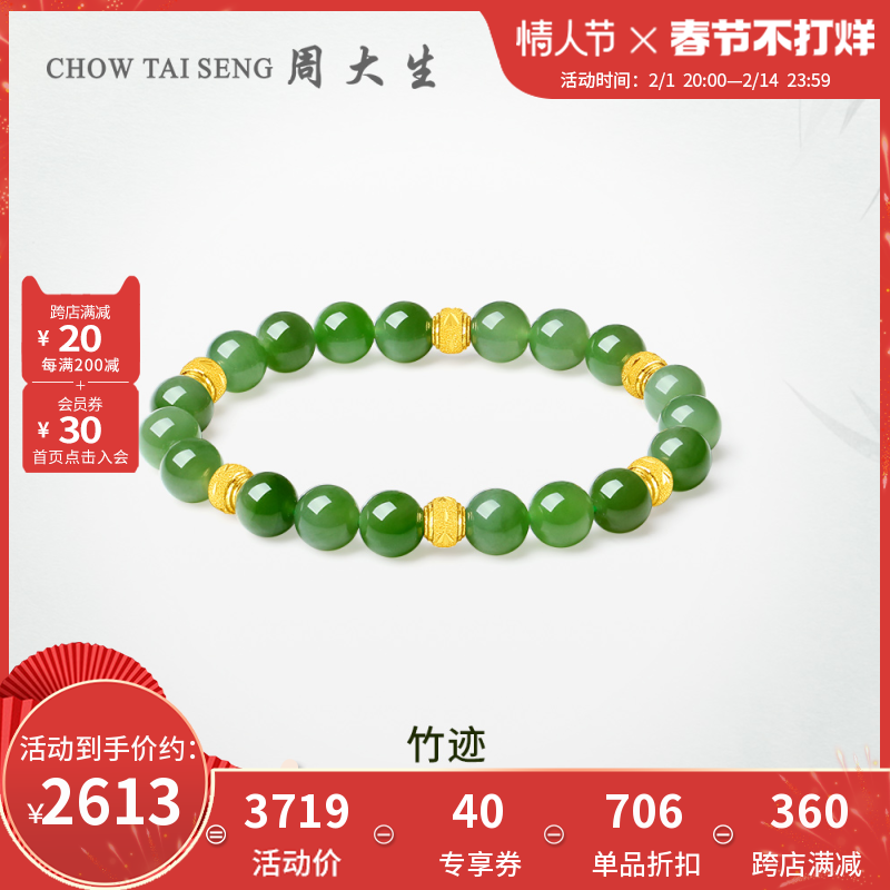 券 381元销量9周大生黄金镶玉和田玉手串女硬金竹节手链节节高升送女友七夕礼物