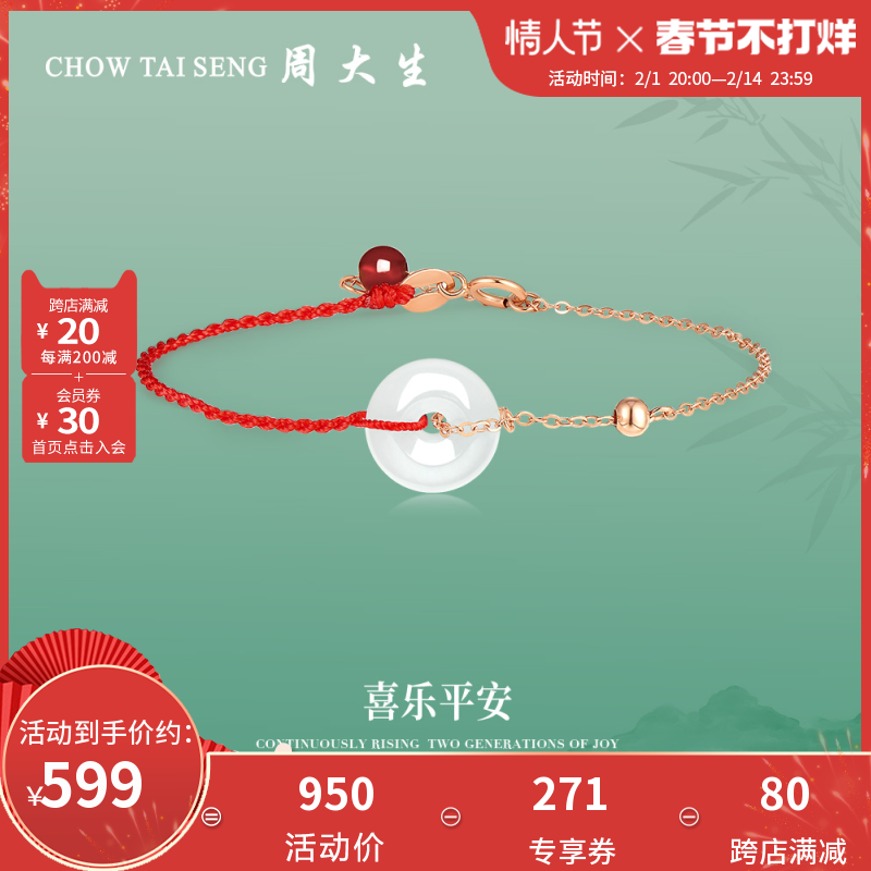 券 295元销量6周大生和田白玉手链女18k金玫瑰金镶玉平安扣红绳手饰送女友生日