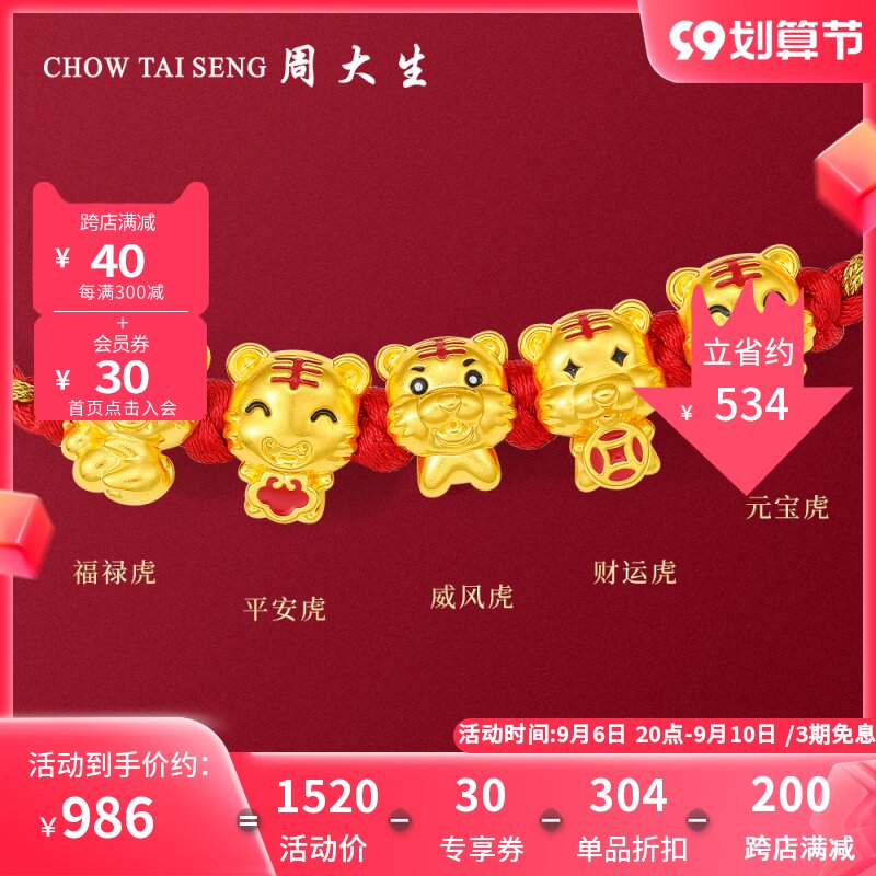 券 40元销量10周大生珠宝首饰老虎黄金转运珠足金五虎手链硬金生肖手串送女友