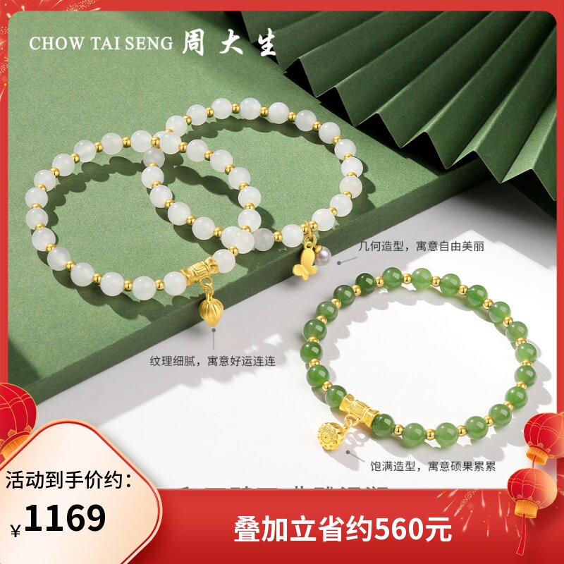 券 560元销量1000周大生黄金镶玉莲蓬手串女款和田白玉蝴蝶莲花金珠手链送女友新年