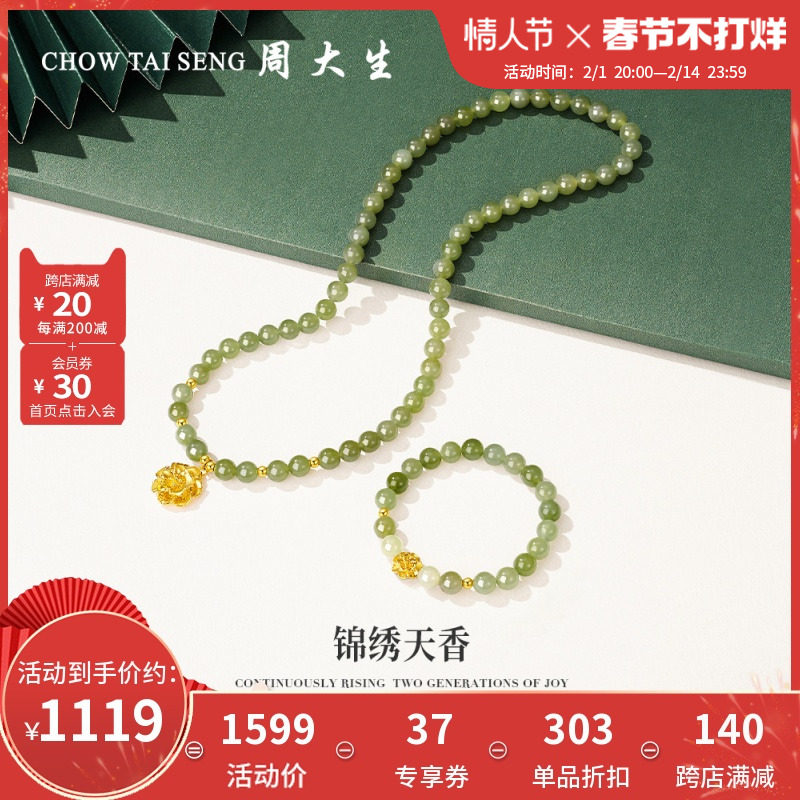 券 37元销量10周大生黄金镶玉和田玉项链女硬金牡丹手链翡翠套装手串送妈妈礼物