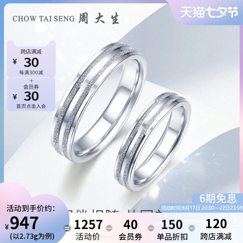 券 47元销量10周大生铂金对戒pt950白金戒指男士磨砂素圈女情侣结婚七夕礼物