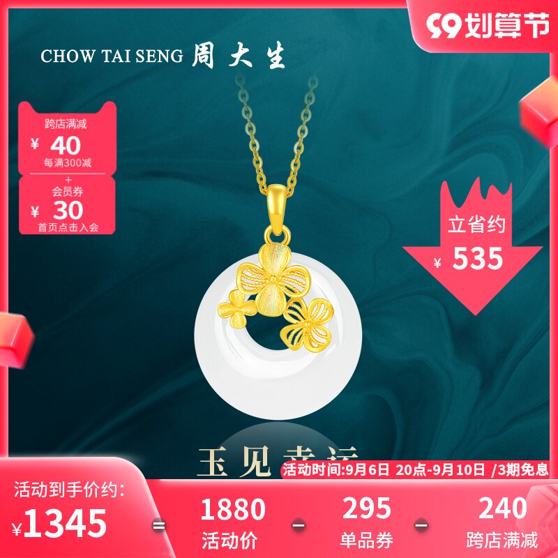 券 301元销量10周大生黄金吊坠女足金四叶草金镶玉足金挂坠和田玉吊坠正品送女友