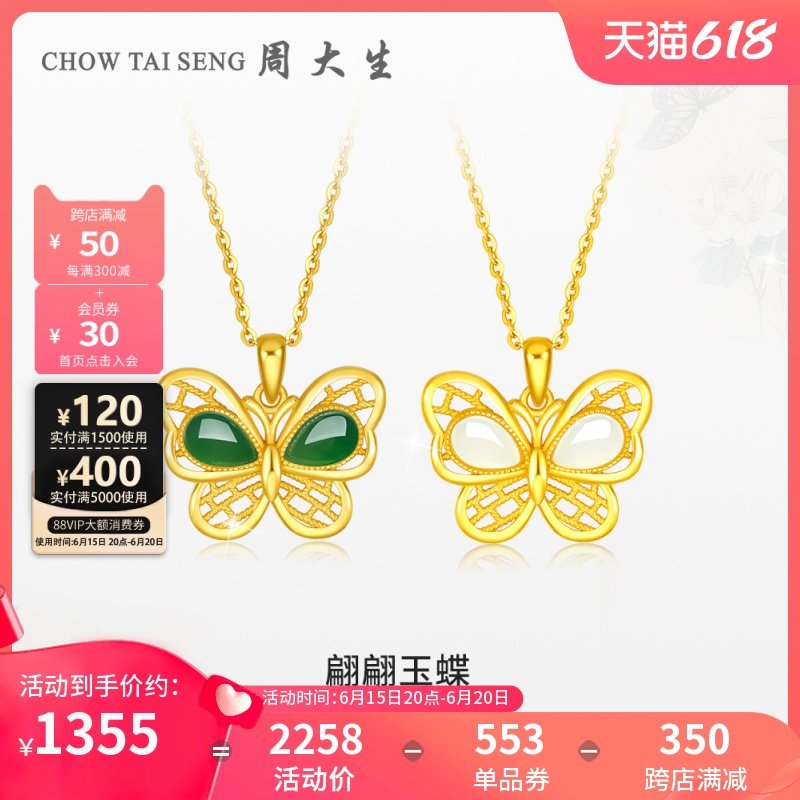 券 560元销量10周大生足金吊坠黄金镶玉硬金蝴蝶黄金花丝和田碧玉挂坠送女友礼物