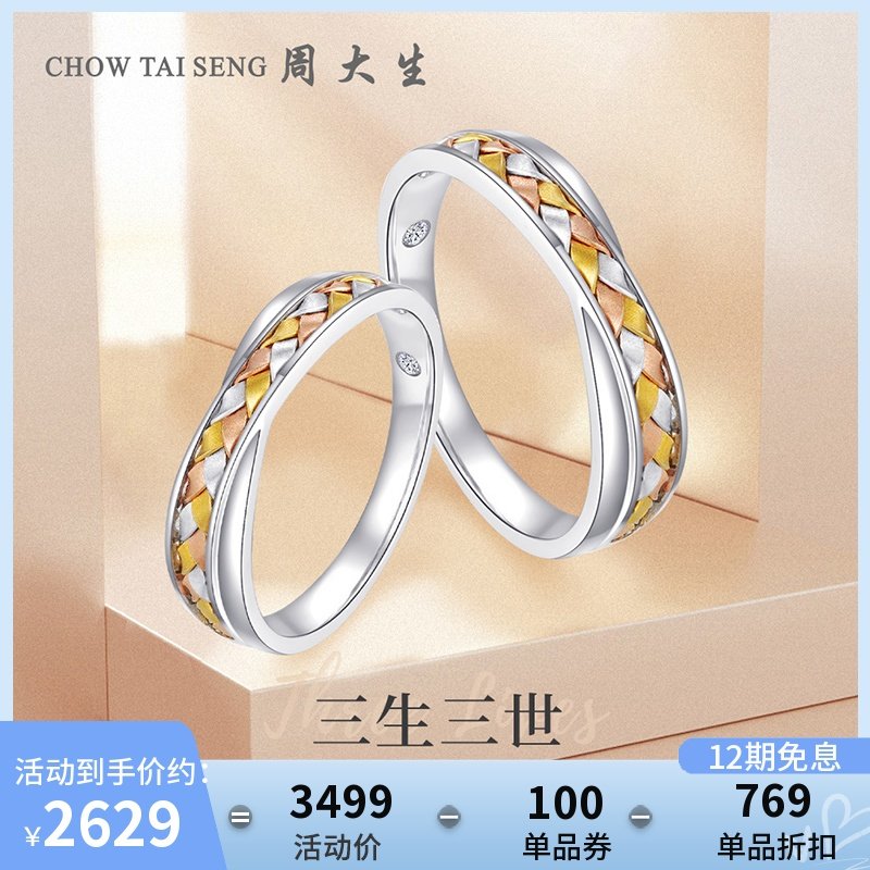 券 120元销量3周大生三生三世钻戒18K金三色编织钻石戒指情侣对戒送女友礼物