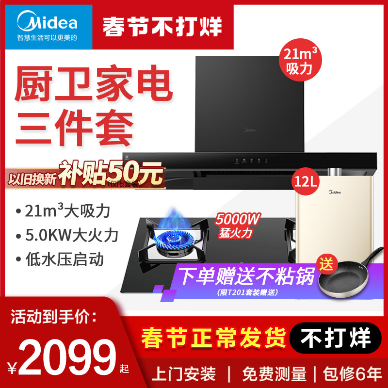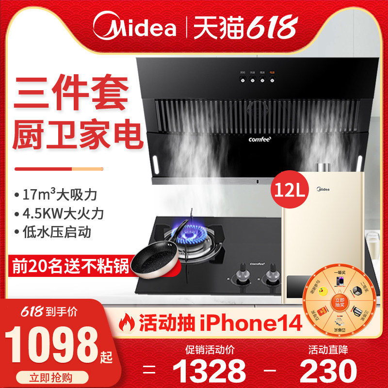 券 105元销量100美的抽油烟机燃气灶套餐comfee家用热水器消毒厨房组合三件套装K3