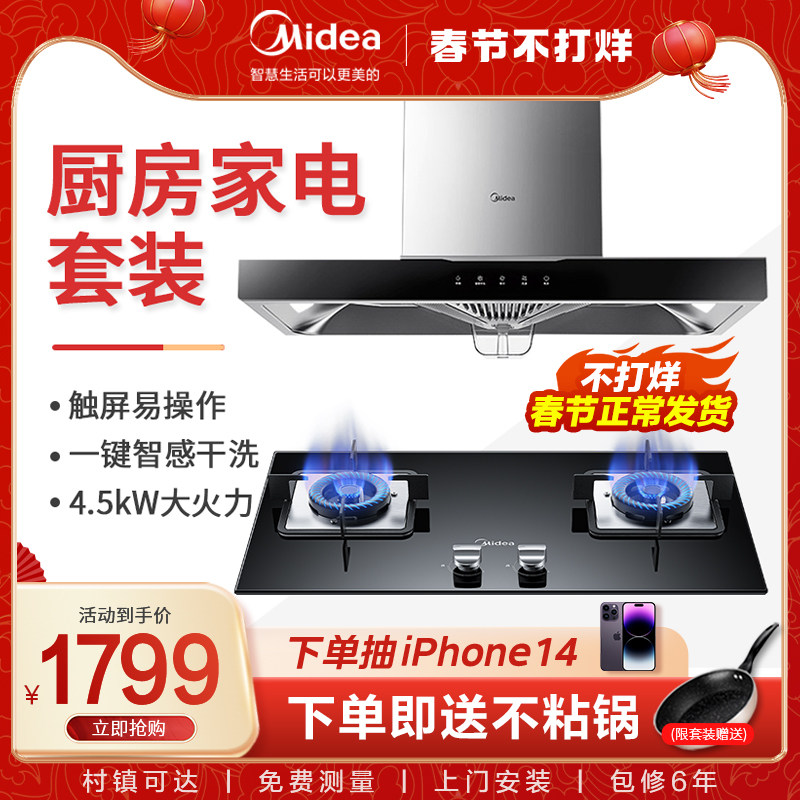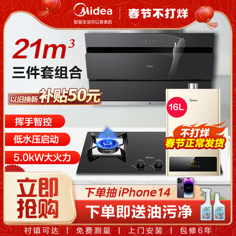 券 550元销量100美的抽油烟机燃气灶套餐智能自动清洗烟灶热水器厨房组合三件套装