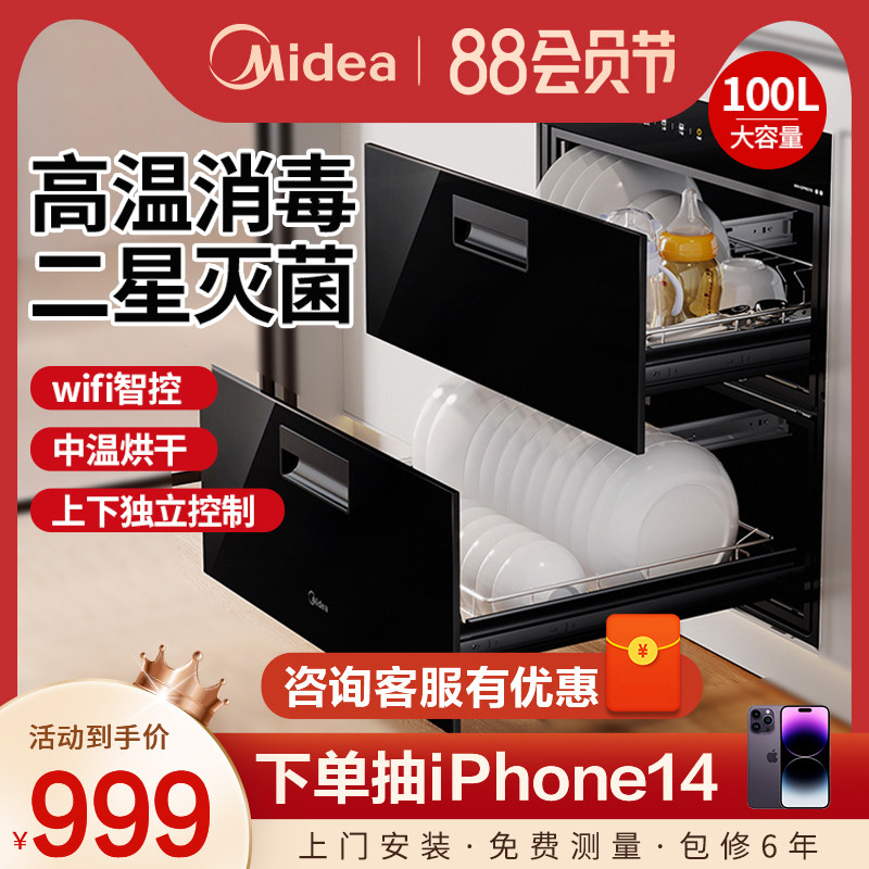券 300元销量100美的消毒柜家用嵌入式厨房碗柜小型智能消毒烘干机碗筷杀菌