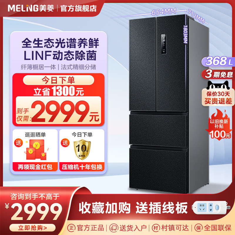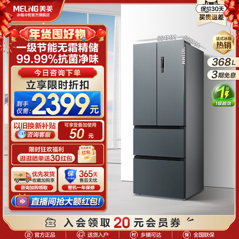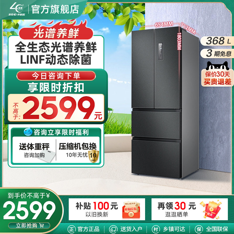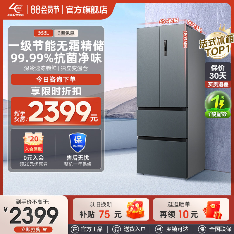 券 2970元销量100美菱官方368L多门四开门一级能效节能无霜法式节能保鲜电冰箱家用