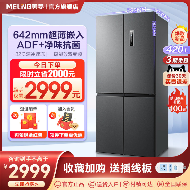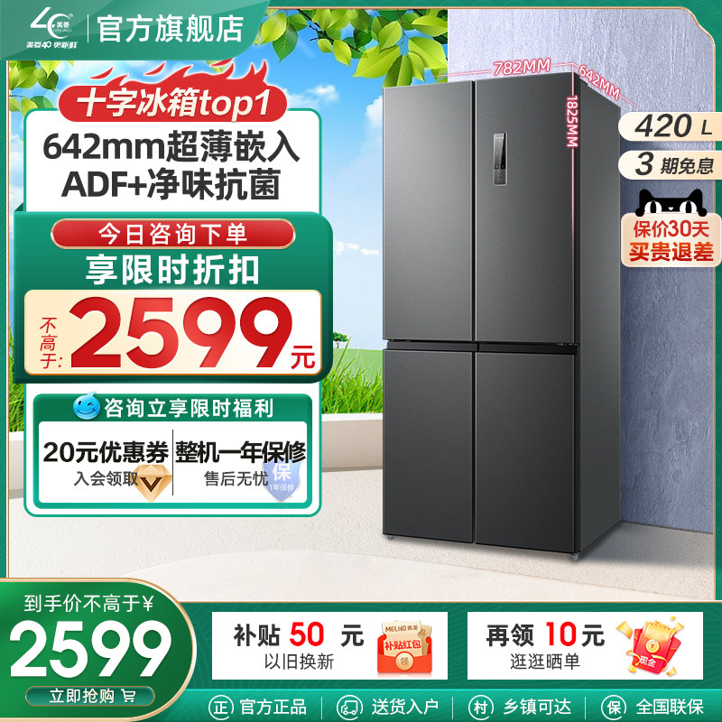 券 1951元销量50【新品】美菱官方超薄嵌入420L家用冰箱十字对开四门一级无霜
