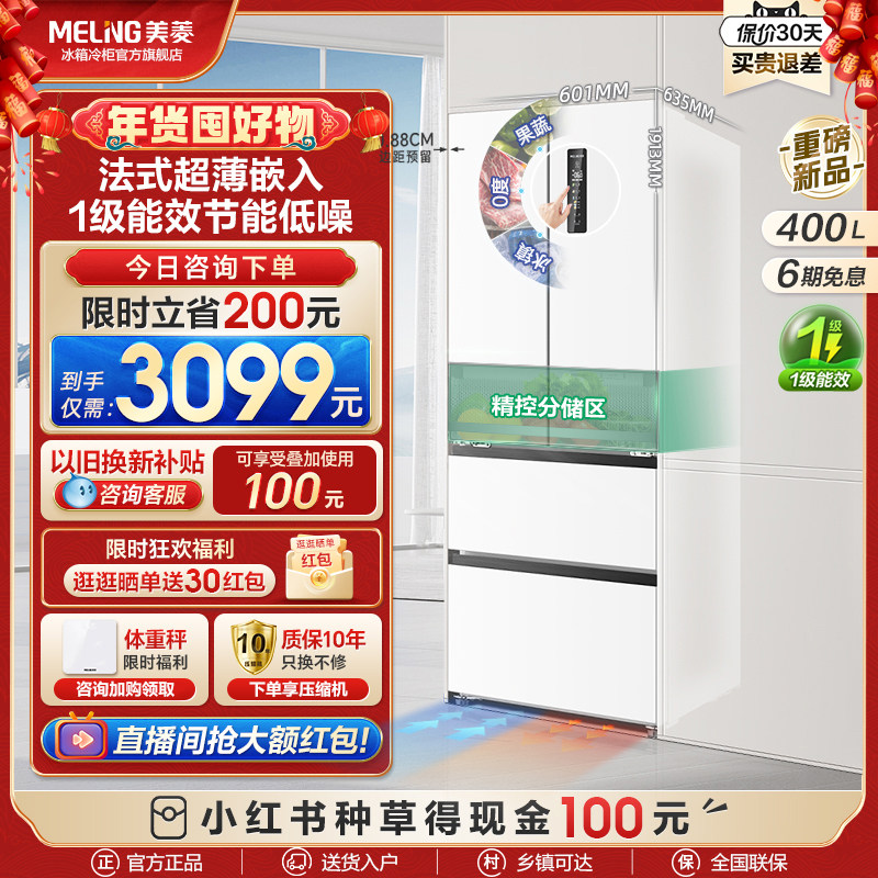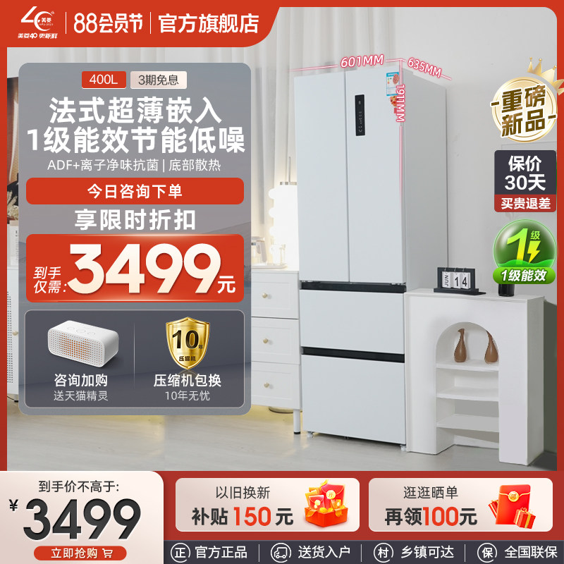 券 251元销量100【新品】美菱400升超薄嵌入式冰箱家用法式四门对开多门白色一级