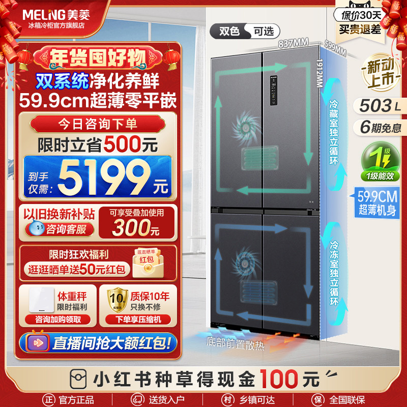【新品】美菱双系统双循环503L超薄嵌入家用冰箱十字四门一级
