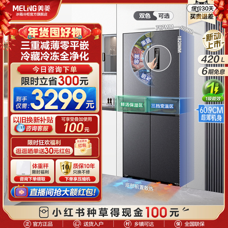 券 50元销量100美菱420L十字四门对开门风冷无霜变频一级节能家用大容量超薄冰箱
