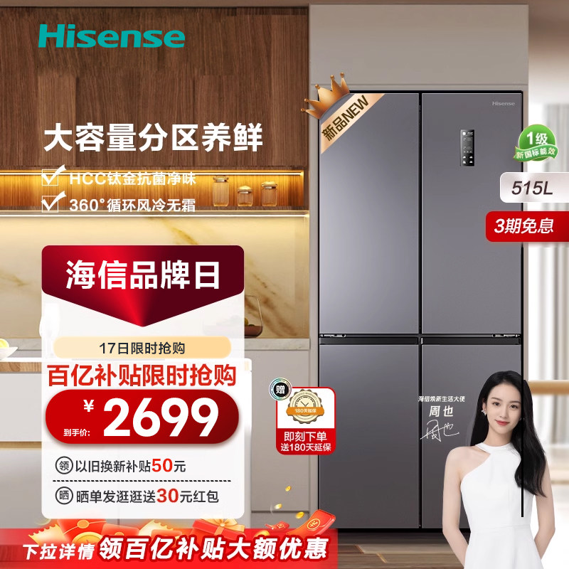券 50元销量200海信515L十字四门双开门大容量风冷无霜一级智能大容量家用冰箱