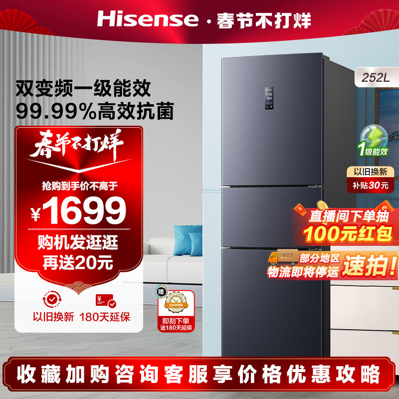 券 1100元销量100海信252L升三门家用双变频小冰箱一级风冷无霜节能租房宿舍小型