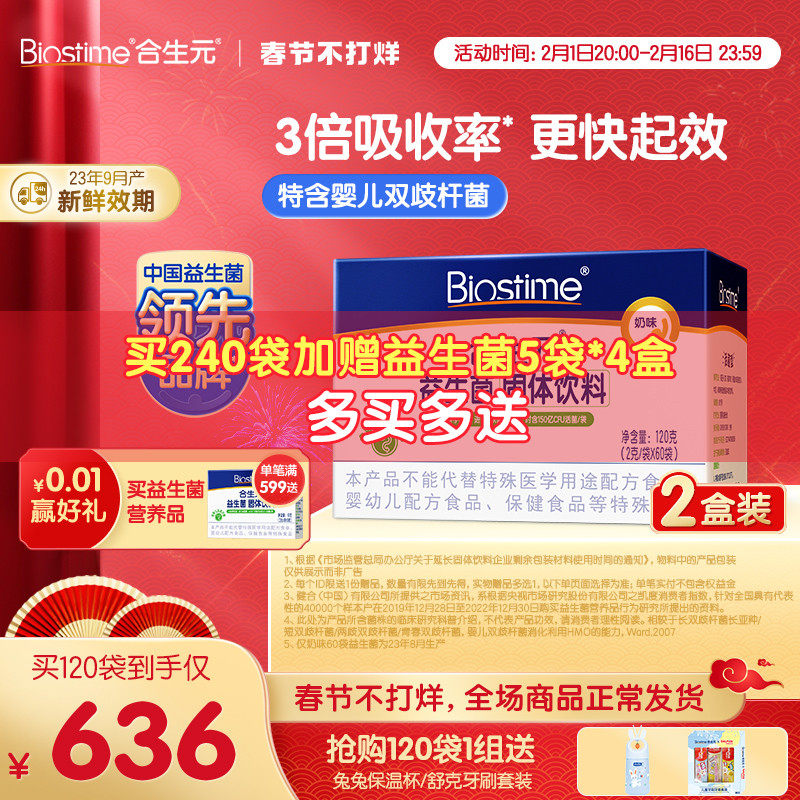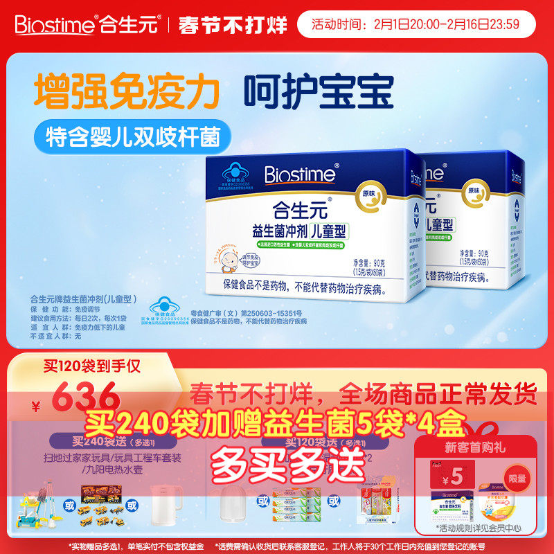 券 260元销量100【过年不打烊】合生元益生菌粉奶味60袋2盒百亿活菌呵护肠胃