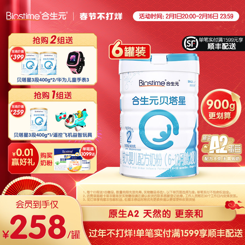 券 260元销量100【过年不打烊】合生元贝塔星A2较大婴儿奶粉2段6罐900g箱装