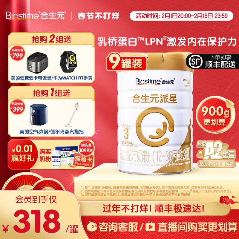 券 500元销量100【过年不打烊极速达】合生元派星婴幼儿奶3段900g*9罐LPN乳桥蛋白