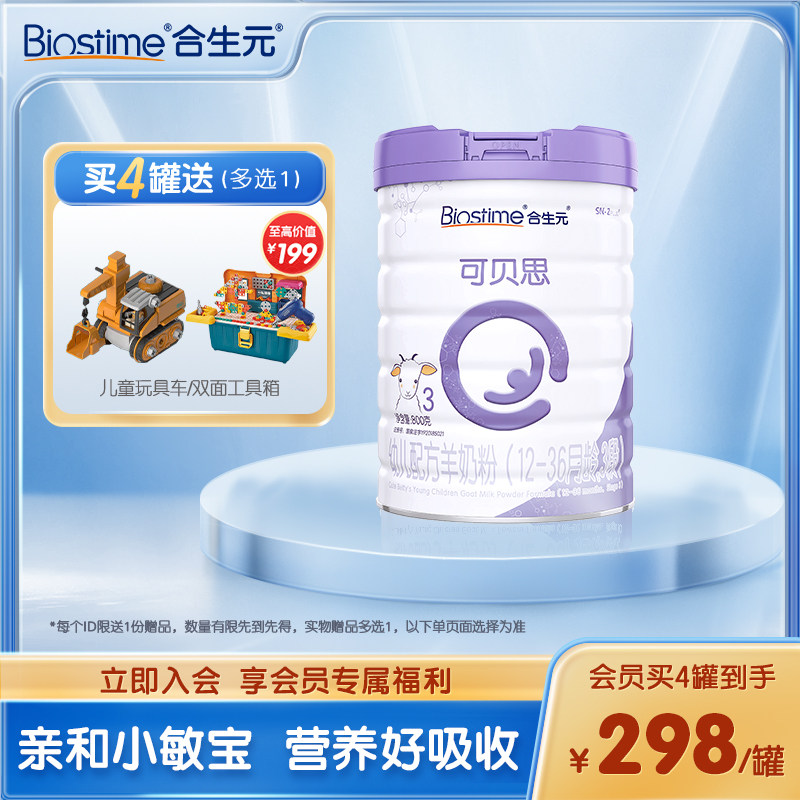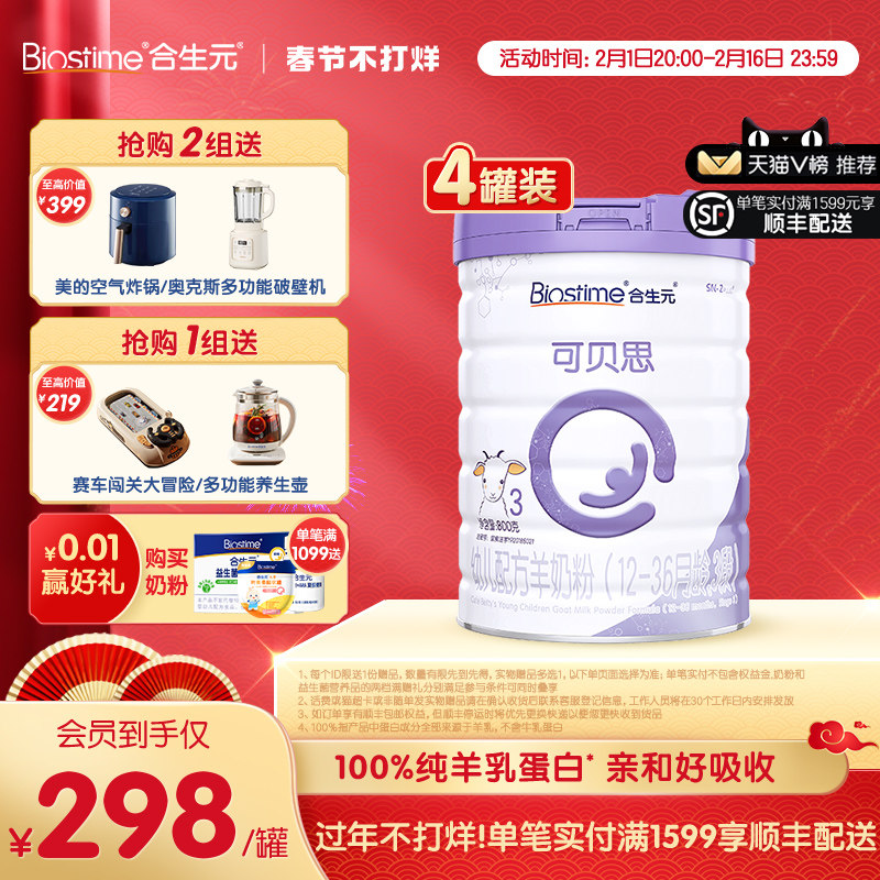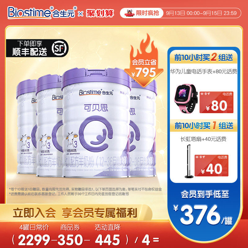 券 390元销量83【过年不打烊】合生元可贝思羊奶粉3段800g*4罐 100%纯羊乳蛋白