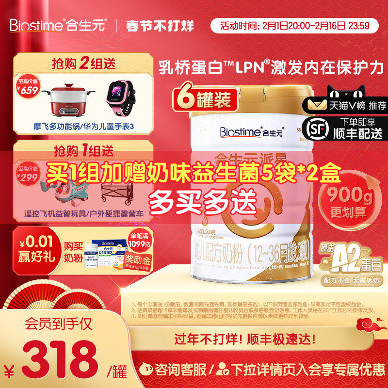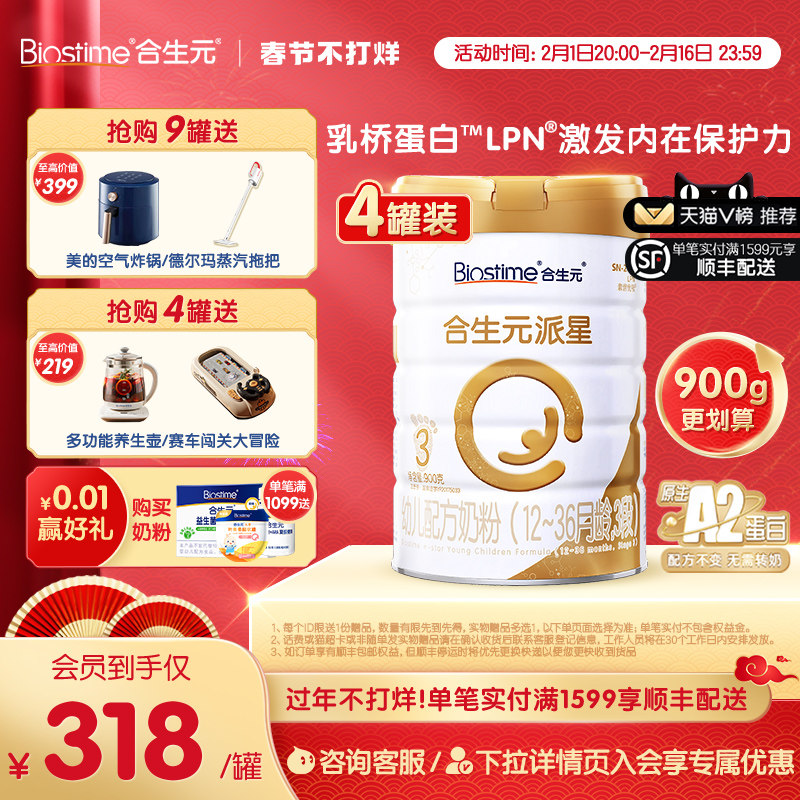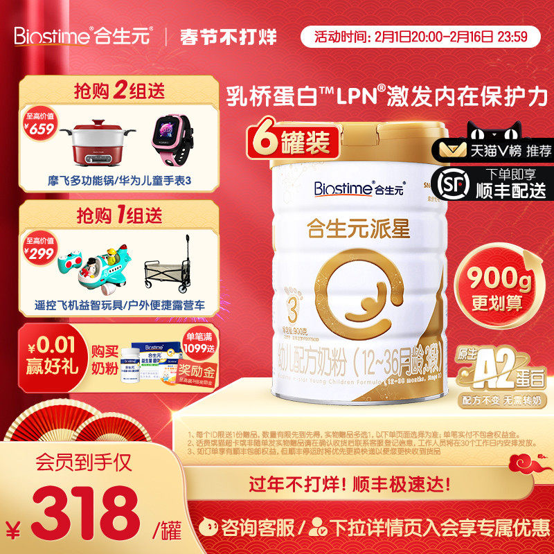 券 310元销量500【过年不打烊极速达】合生元派星A2版婴幼儿配方牛奶粉3段900g6罐