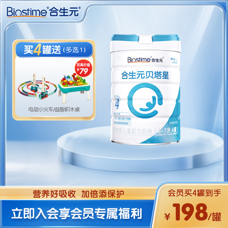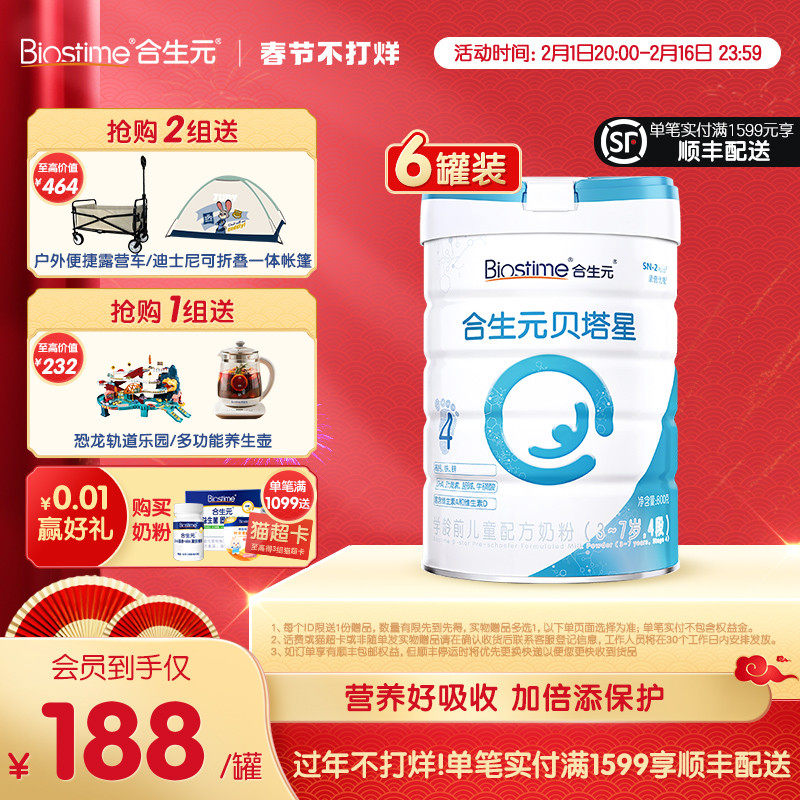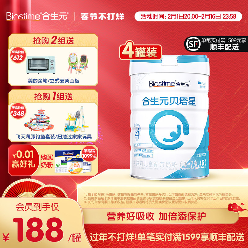 券 200元销量3【过年不打烊】合生元贝塔星学龄前儿童成长配方牛奶粉4段6罐800g