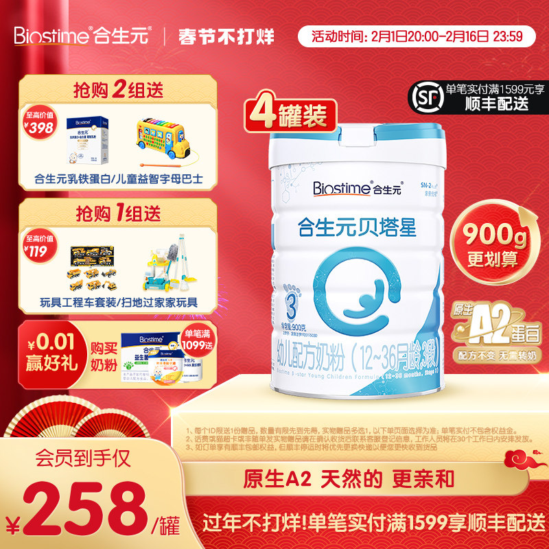券 250元销量50【过年不打烊】合生元贝塔星A2幼儿奶粉3段4罐900g益生元乳清蛋白