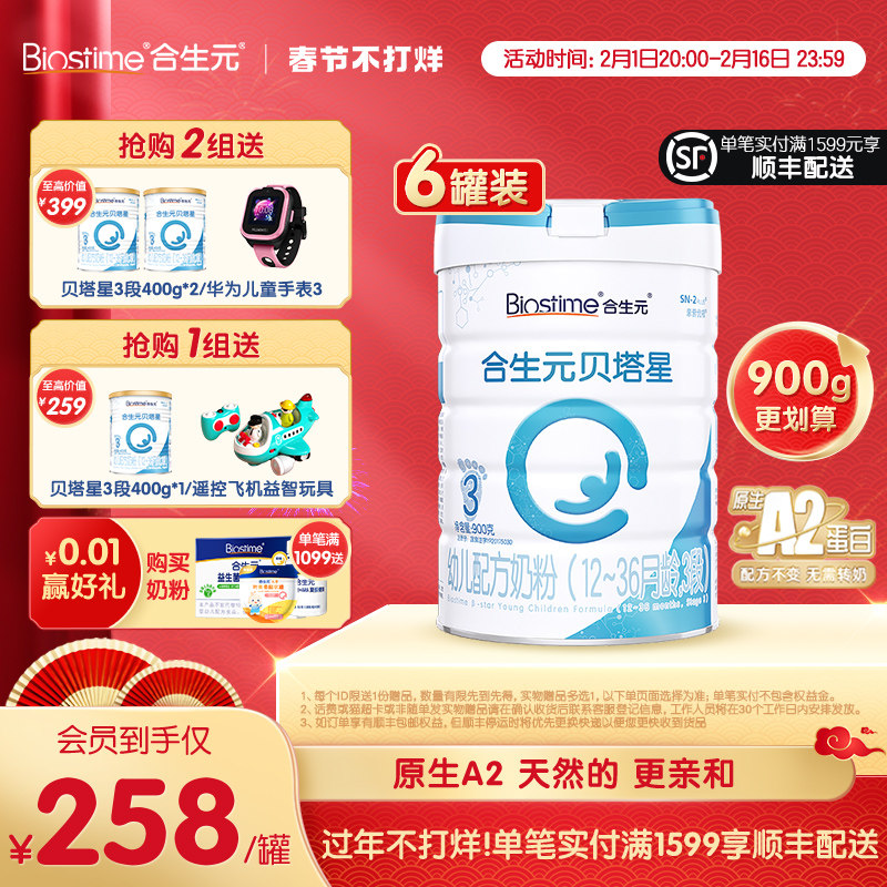 券 260元销量100【过年不打烊】合生元贝塔星A2幼儿奶粉3段6罐900g益生元乳清蛋白