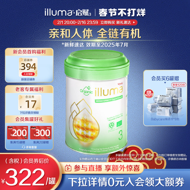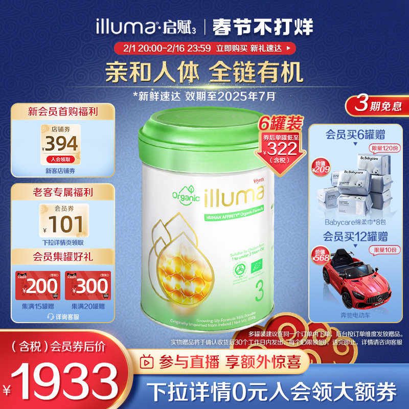券 216元销量10【6罐】惠氏启赋3段婴幼儿牛奶粉有机奶源爱尔兰进口850g官方