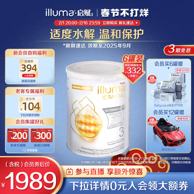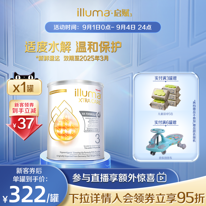 券 369元销量50【6罐】惠氏启赋敏适HA3段HMO适度水解低敏婴幼儿奶粉800g