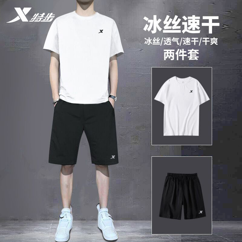 券 10元销量100特步运动套装男2023夏季新款官方正品透气速干训练健身跑步两件套