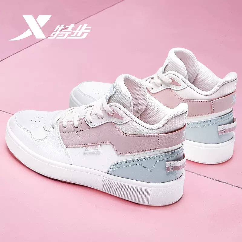 券 10元销量100特步女鞋高帮板鞋2023秋冬官方正品学生休闲鞋皮面防水运动鞋女款