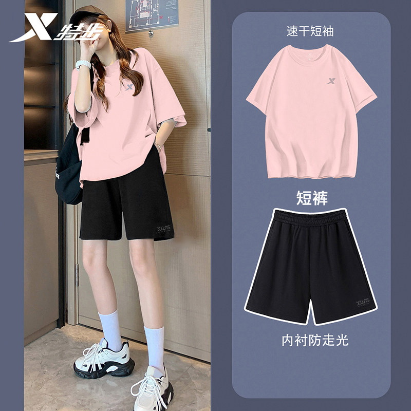 券 10元销量300特步运动套装女2023夏季新款圆领上衣速干透气短袖短裤运动两件套