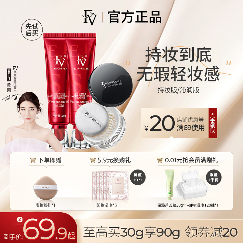 券 20元销量5000FV红钻粉底液保湿水润控油遮瑕持久不脱妆混干油皮女旗舰官方正品