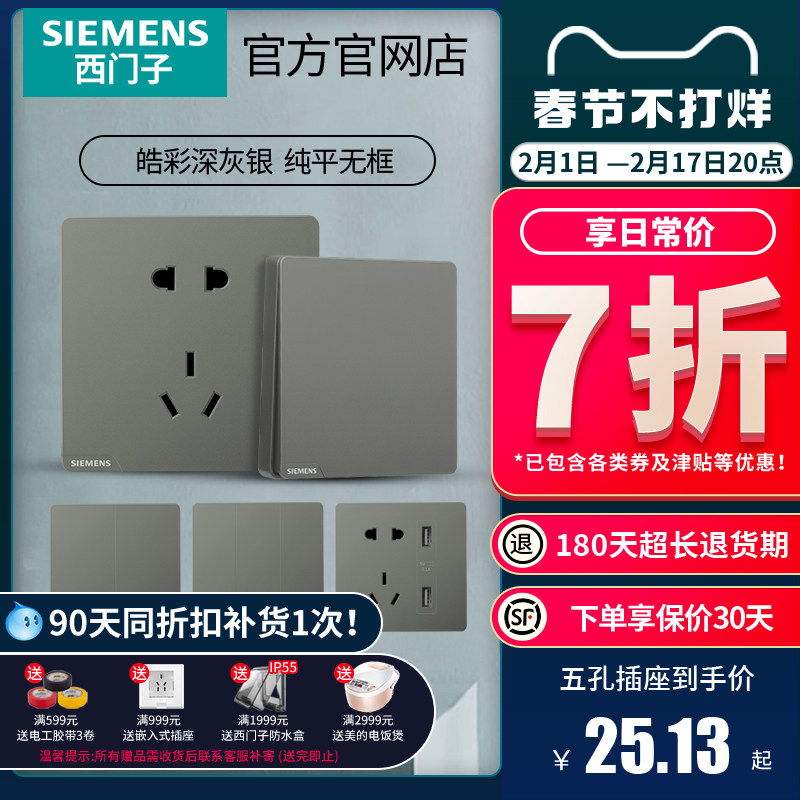 券 2元销量50西门子皓彩深灰银家用错位斜五孔插座带双usb开关插座面板套餐