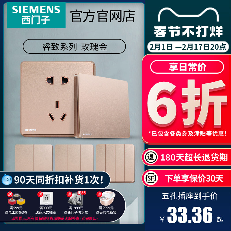 西门子开关插座86型家用睿致玫瑰金大面板五孔插座开关面板套餐