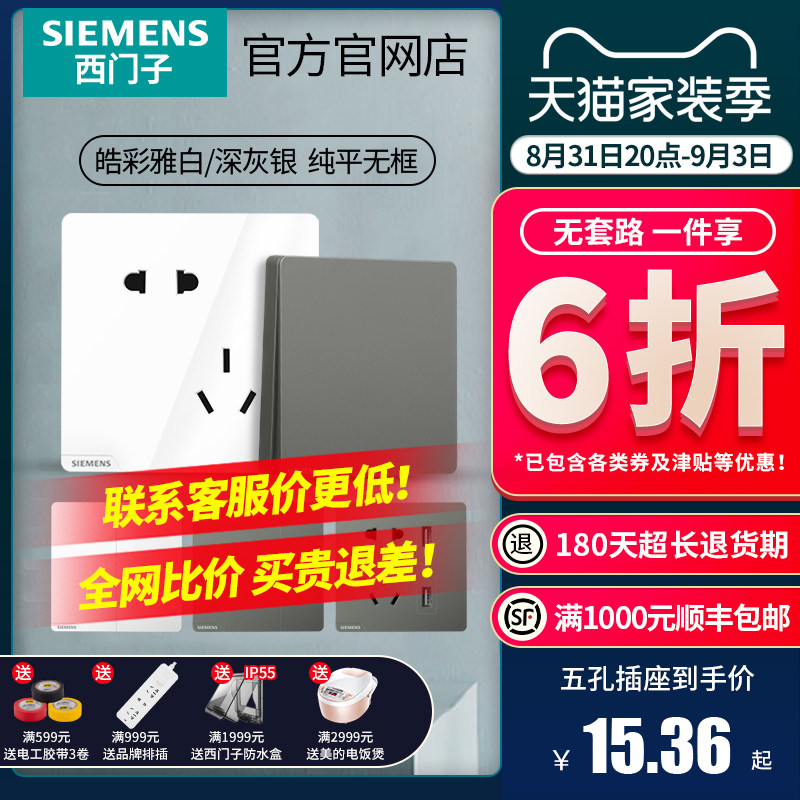 券 2元销量10西门子开关插座面板皓彩雅白/深灰银错位斜五孔插座带双usb套餐