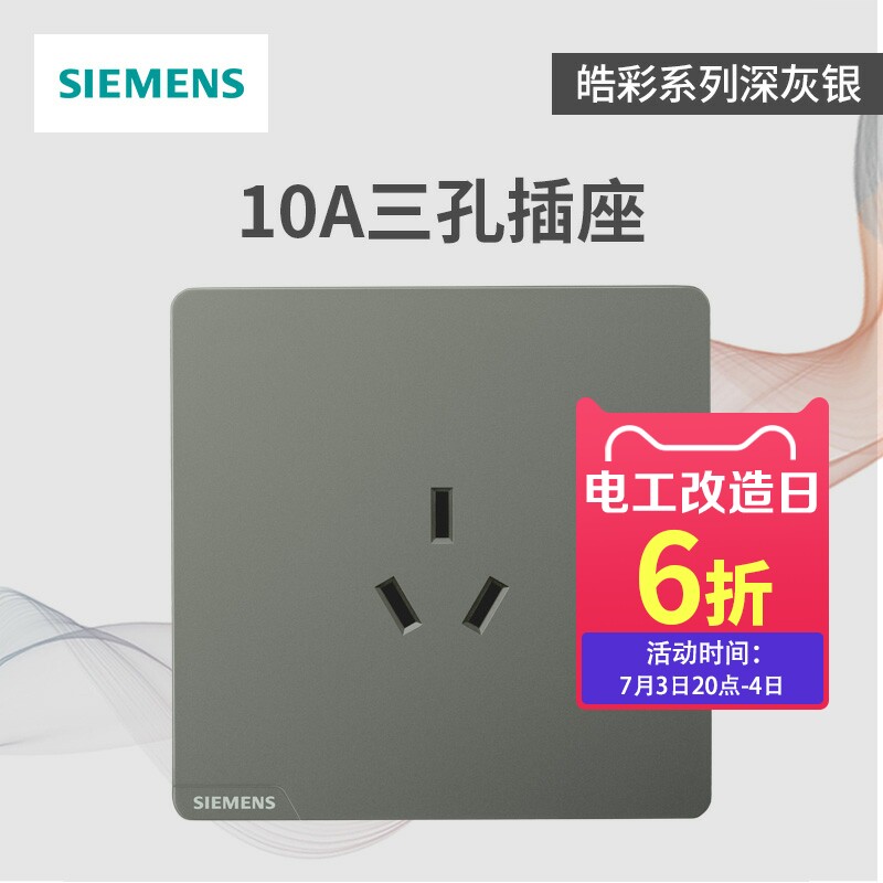 券 1元销量100西门子开关插座面板 皓彩深灰银家用86型10A三孔插座面板