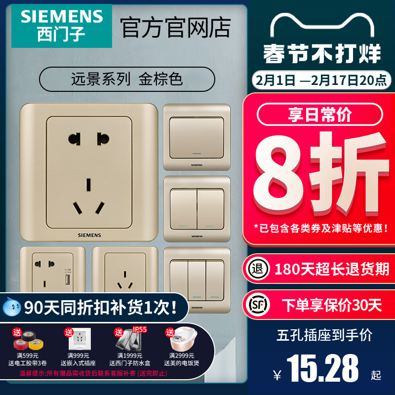 券 2元销量50西门子开关插座远景金棕86型家用电源5五孔插座带一开关面板套餐