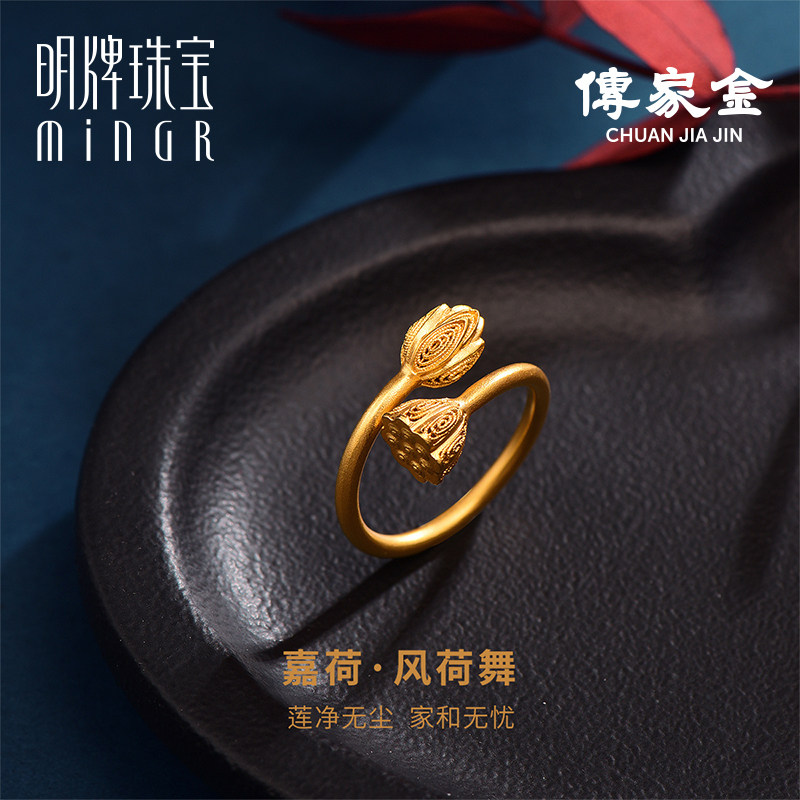 券 50元销量8明牌珠宝古法黄金戒指 嘉荷传家金拉丝莲蓬荷苞国潮女戒 AFM0180
