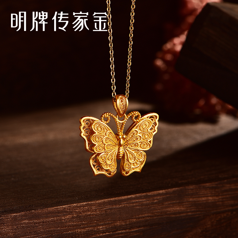 券 100元销量84明牌珠宝古法黄金蝴蝶吊坠 传家金蝶舞项坠足金镂空福蝶AFC0687