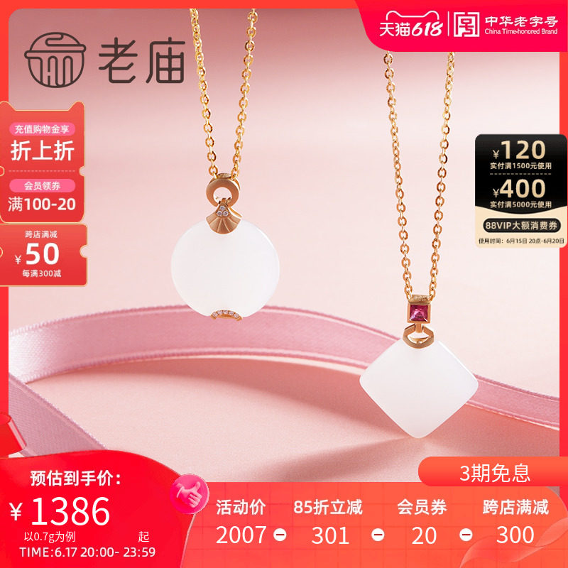 券 50元销量2老庙黄金K金镶玉钻石碧玺挂坠送礼定价赠银镀黄金色项链官方正品